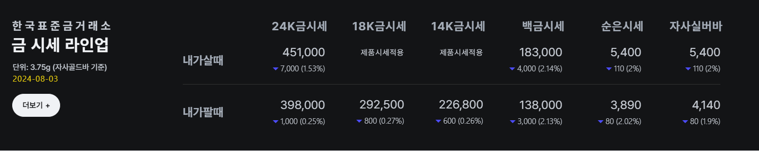 ์ค๋ 2024๋ 8์ 4์ผ ๊ธฐ์ค์ผ๋ก ์๊ธ 1๋์ ๊ฐ๊ฒฉ์ด ์ผ๋ง์ธ์ง ์์ธ์? ํ๊ตญํ์ค๊ธ๊ฑฐ๋์์ ๋ฐ๋ฅด๋ฉด, ์๊ธ 1๋์ ์ด ๋ ๊ฐ๊ฒฉ์ด 451,000์(VAT ํฌํจ)์ด๋ผ๊ณ ํฉ๋๋ค.